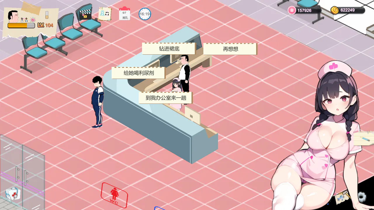这是一款18禁的医院模拟经营游戏。您将扮演医院的院长,管理一个医院。