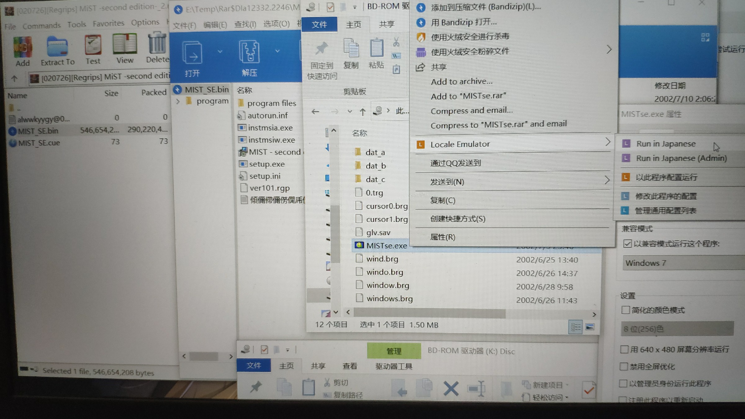 从左往右:下载后,会出现第一张图,解压.bin文件,出现第二张图,然后打开setup.exe,自己选择一个文件夹进行安装,游戏文件夹就是第三张图,安装后将游戏文件夹进行镜像文件压缩(.iso格式),再使用虚拟光驱挂载,然后设置兼容性Win7(如果是Win10),最后转区即可游玩(如果提示错误就兼容成XP/98然后管理员运行)