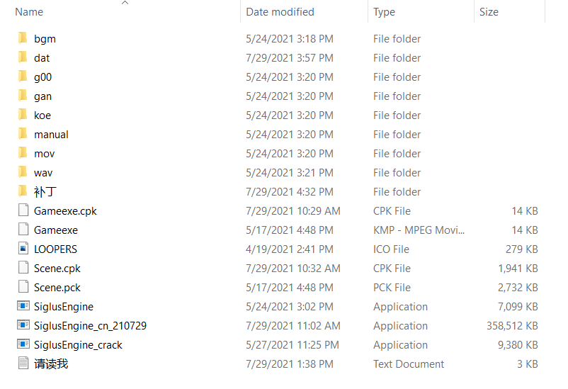 - 用winrar解压后直接执行SiglusEngine_cn_210729.exe游玩。如果电脑系统地区不是‘简体中文,中国’,请用Locale Emulator转区执行SiglusEngine_cn_210729.exe游玩。