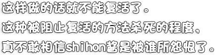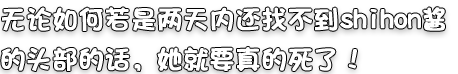 友人。死亡。 霜雪 しほん(しもゆき しほん) CV:猫村ゆき 身長:159センチ 空丘夕陽の親友。 自分勝手な性格だけど手に負えないほどの甘え上手なので、自分の思い通りに物事を進めることができる。 空丘夕陽に異常なこだわりを見せて、いつもラブラブしたがっている。 何者かに殺されて首を切断され、頭部をどこかに隠されてしまう。 |